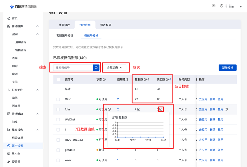 1. 操作入口:营销通-账户设置-授权应用-微信号授权