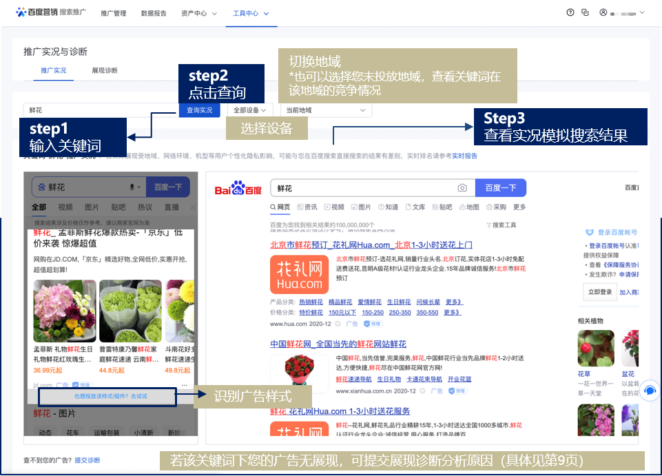 “推广实况与诊断”工具帮助您查看广告的线上样式,分析关键词无展现原因,轻松解决投放问题,提高您的广告投放效率!