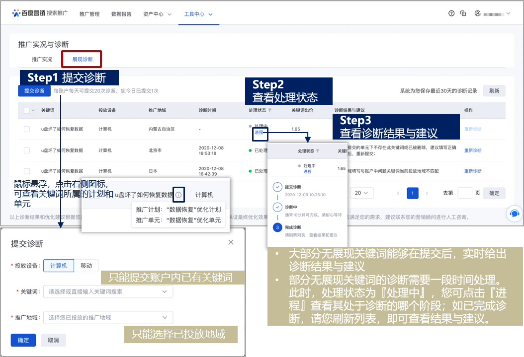 点击提交诊断——选择投放设备,输入关键词,选择投放地域,提交诊断——等待诊断——查看诊断结果与建议