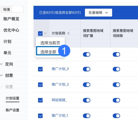 Step1:点击推广计划列表顶部表头复选框旁侧箭头----点击「选择全部」按钮