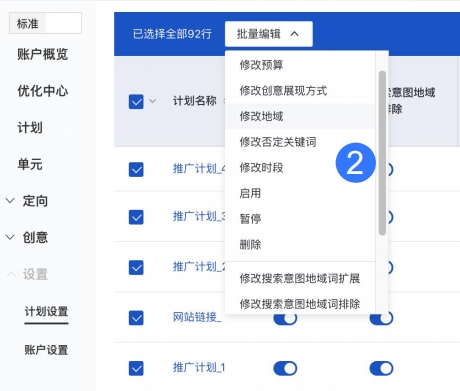 1. 支持全选计划、单元或定向(关键词、人群、网址、词包)进行批量操作,提升批量能力;