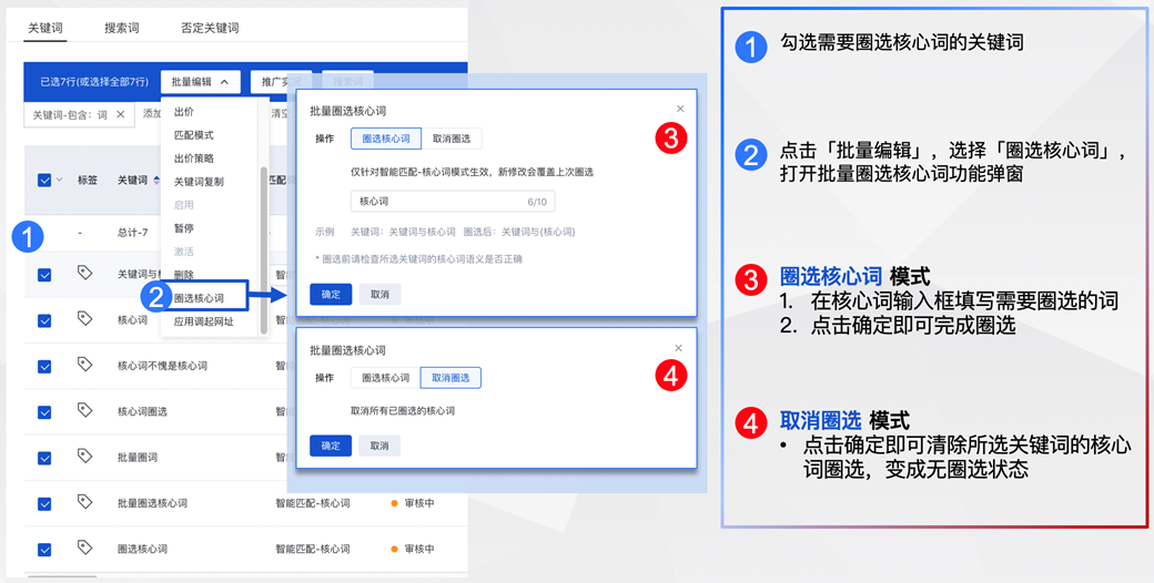 - 勾选关键词,点击「批量编辑」,选择「圈选核心词」