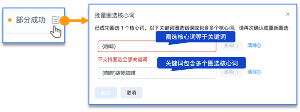 在非全选关键词状态下批量圈选核心词,触发二次确认时: