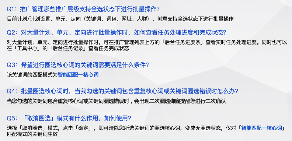 1.推广管理中计划、单元、定向(关键词、网址、人群和词包)支持全选时进行以下批量操作