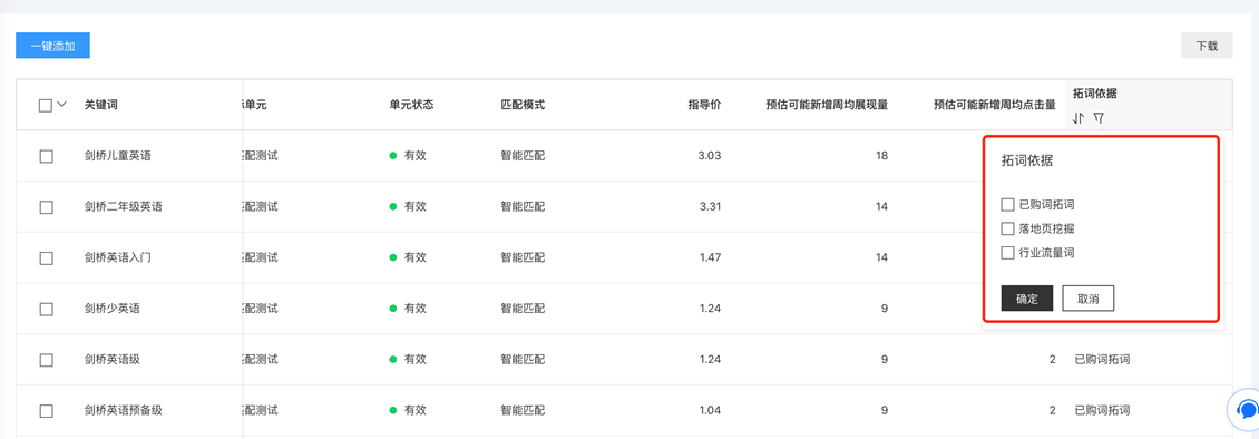 A2:广告主可在关键词推荐列表的「拓词依据」列查看各推荐关键词的来源,选择更适合自己推广业务的关键词。其中「已购词拓词」是指根据广告主近期购买的关键词,提供搜索用户所关心的同类好词;「落地页挖掘」是根据广告主近期的推广落地页的内容,提供和落地页信息相关的新关键词,帮助提高落地页相关性;「行业流量词」根据近期同行业的用户搜索趋势,提供用户搜索热度较高的关键词,帮助您及时追踪用户热点。