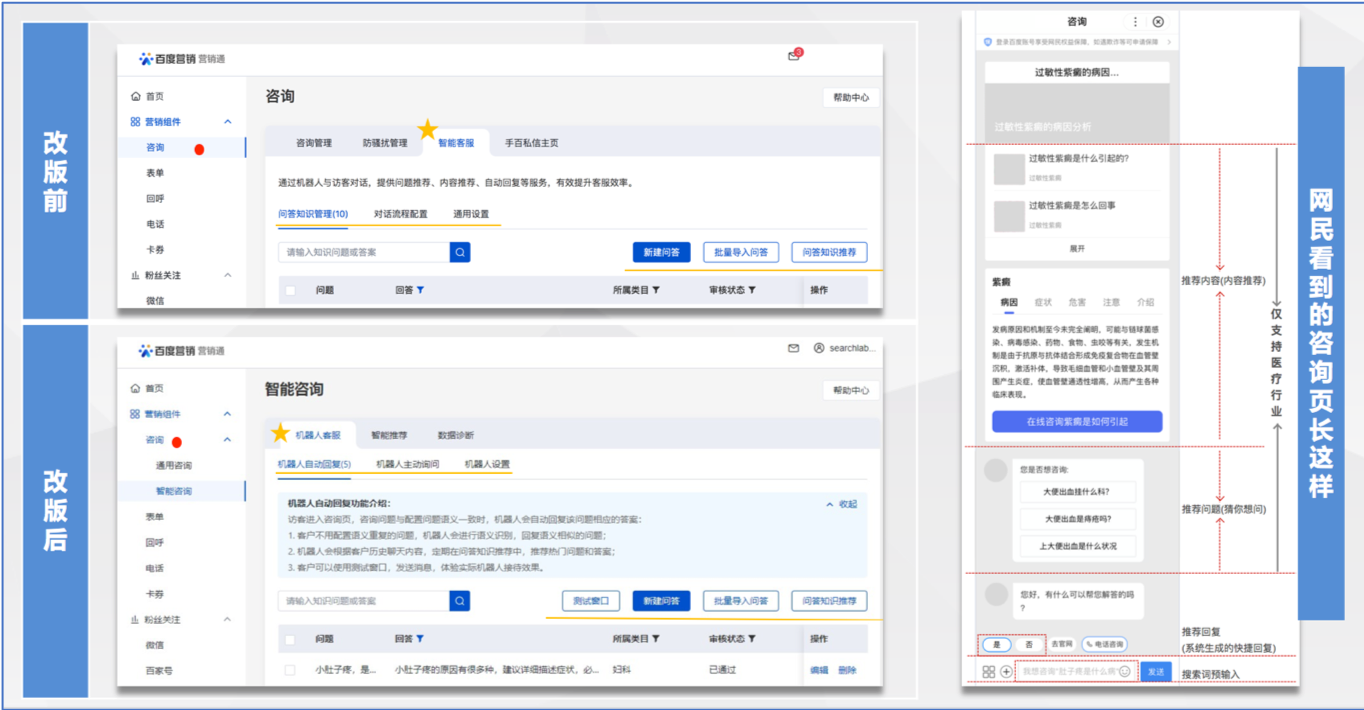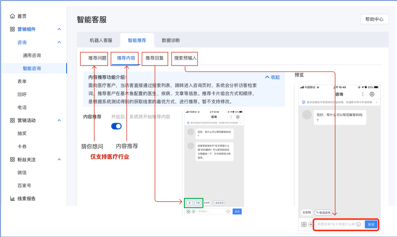 1、面向医疗行业的猜你想问和内容推荐功能均收口至智能推荐分类下,更名为推荐问题及推荐内容。