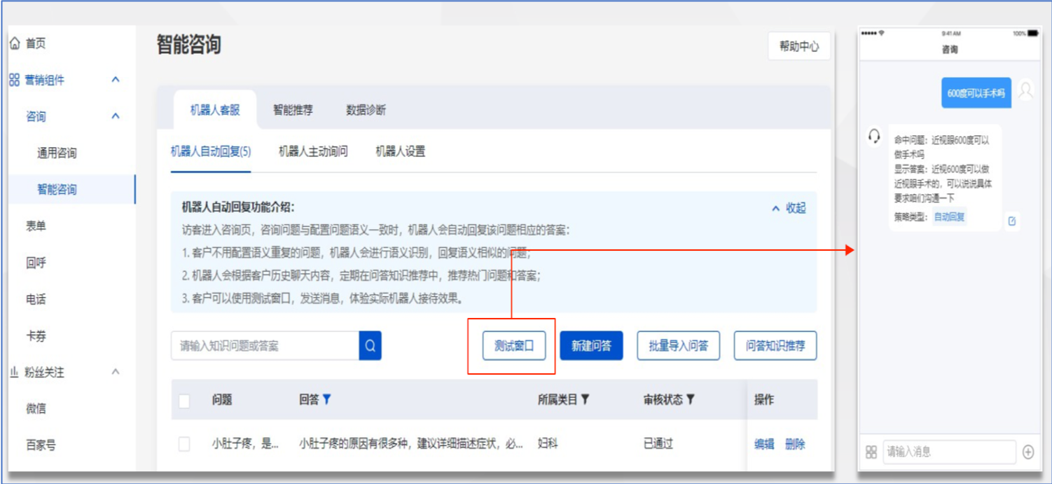 2、机器人自动回复增加测试窗口,支持在线预览机器人的回复内容,问答的命中情况,并可直接点击编辑进行修改。
