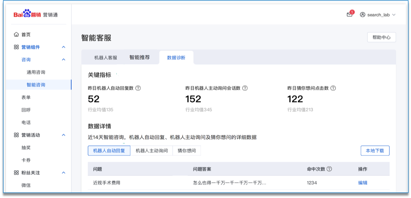 提供机器人自动回复、主动询问及猜你想问(仅医疗行业)的数据分析。包含问题被命中的次数、机器人回复的对话数,猜你想问的展点数等等,便于客户根据数据表现进一步优化机器人的服务效率。
