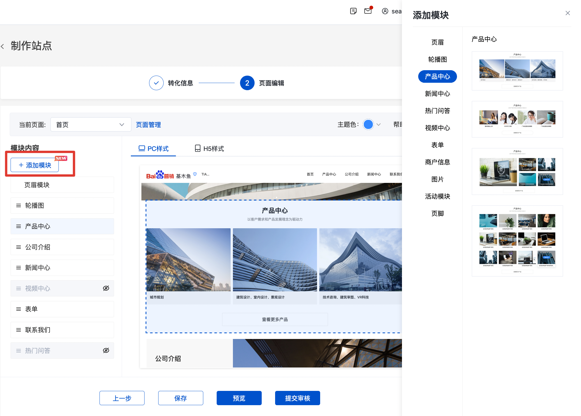 页面编辑页面,增加“添加模块“入口,点击按钮,页面右侧弹窗侧拉门,选择需要添加的对应模块。模块添加完成后,点击编辑按钮进行模块编辑,方式与原操作流程一致。