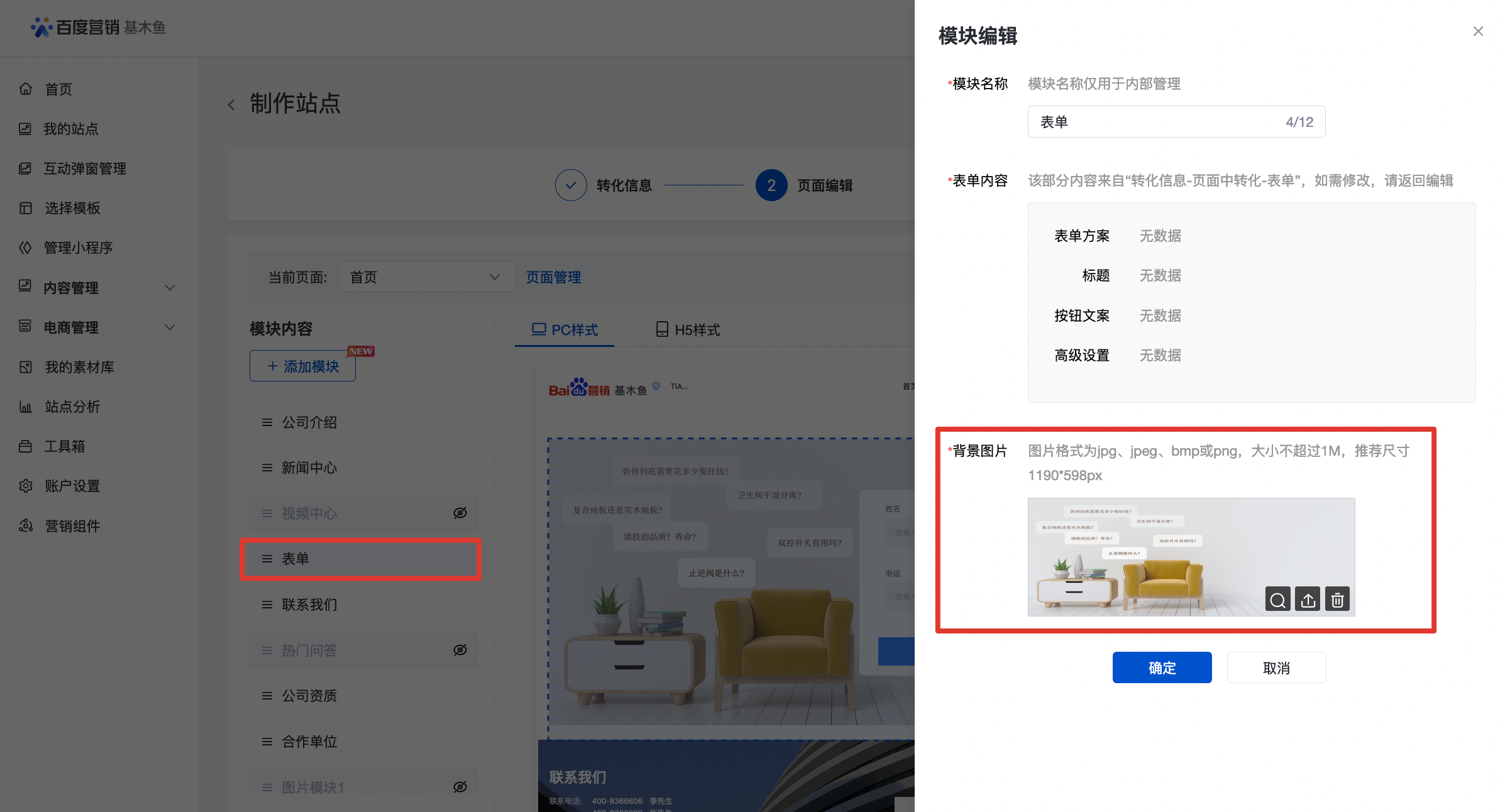 3、背景图片:必填项,图片格式为jpg、jpeg、bmp或png,大小不超过1M,尺寸要求 1420*598px;