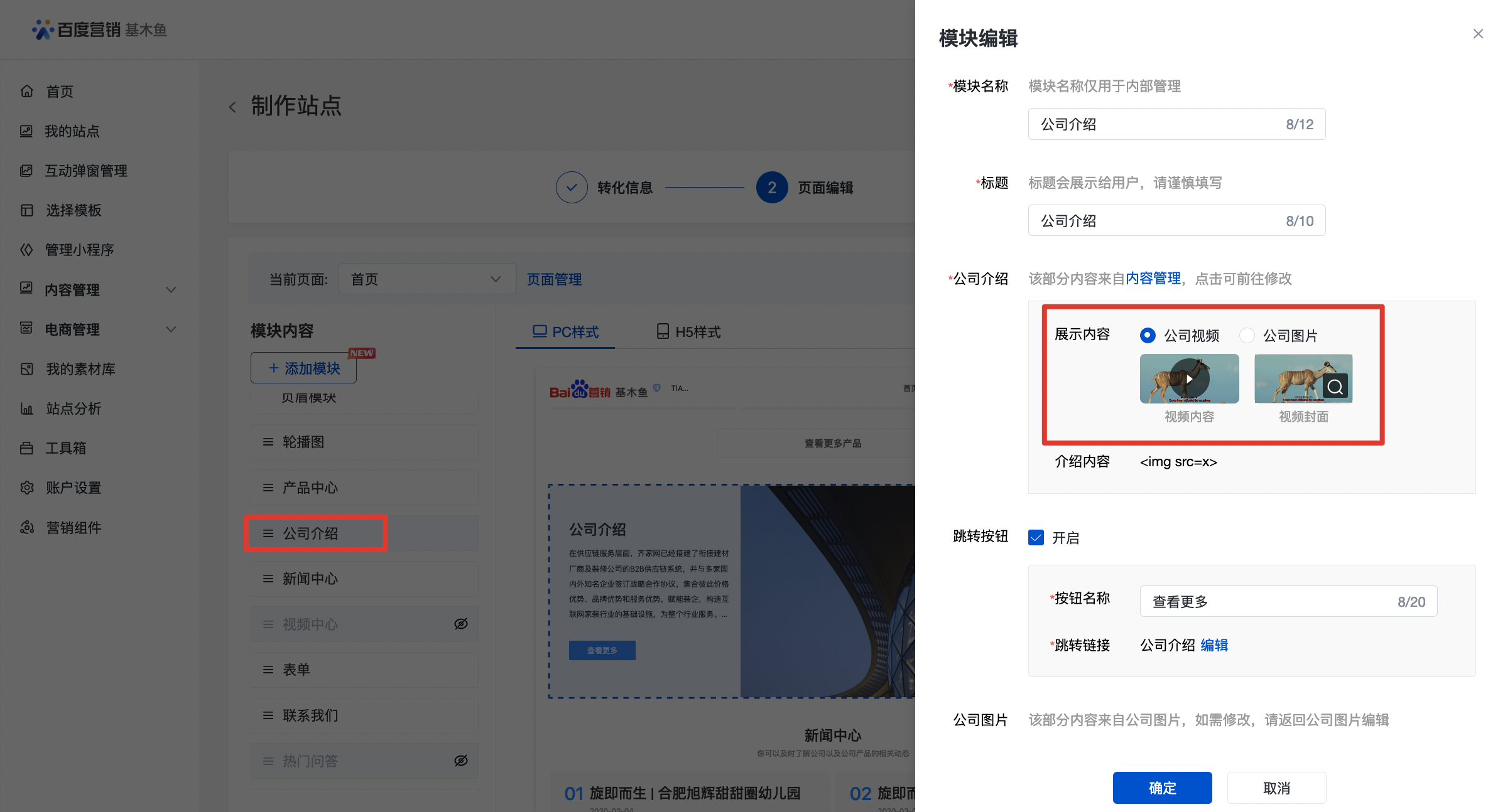 点击添加模块,进入右侧侧拉门编辑页面,按照要求字段(模块名称、标题、副标题、视频内容等)完成填写并保存;