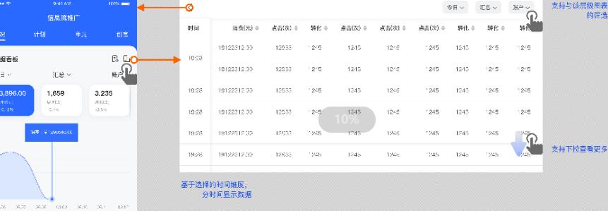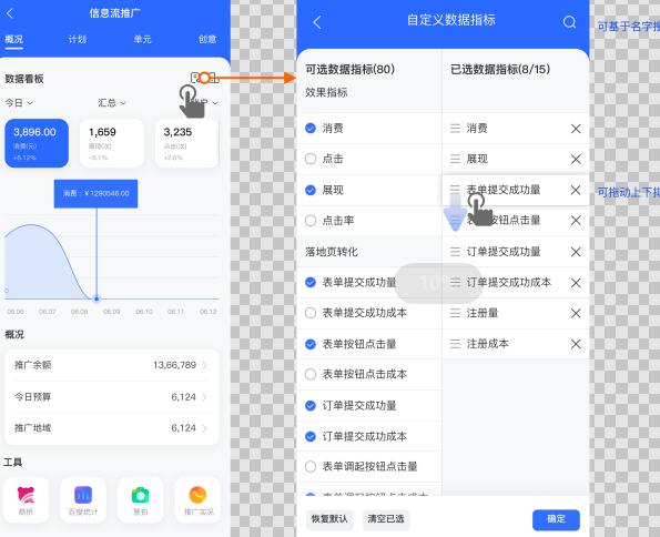 为了满足客户对推广账户数据的查看需求,全面把握投放情况,百度营销手机版对“数据报告”功能进行全面升级。接入全量转化指标,客户可通过自定义设置指标,对关注的关键转化指标进行设置,并引入横屏查看数据功能,更方便广告主随时随地的监控数据情况,提升数据监控效率。