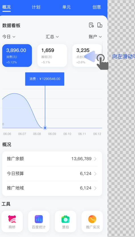概况页、物料详情页等的数据图表,上方「数据指标区域」支持滑动查看多项指标,您在自定义列选择的指标全部可查看,最多15个,目前新上线支持今日/昨日查看对比数据。