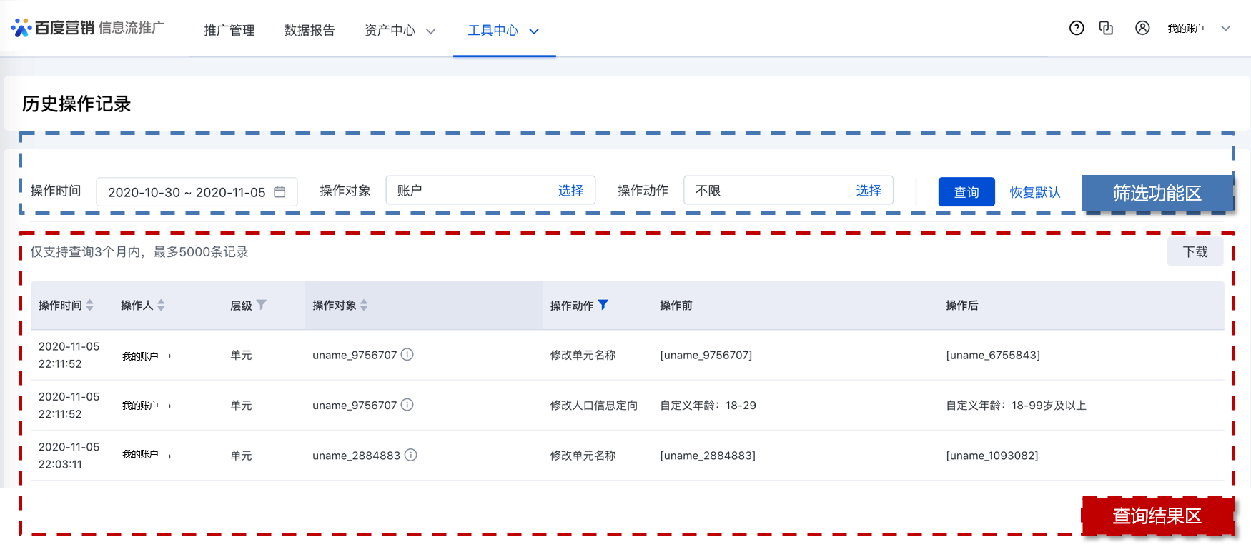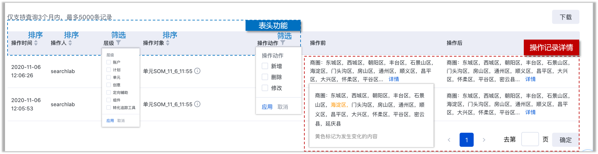 - 查询结果区:在查询结果区,您可查看操作记录明细,点击右上角【下载】按钮导出更详细的操作记录内容,方便管理