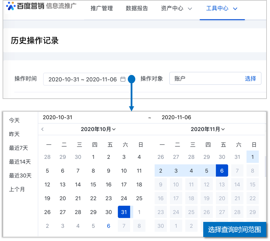 - 支持快捷选择查询「今天」「昨天」「最近7天」「最近14天」「最近30天」和「上个月」的操作记录