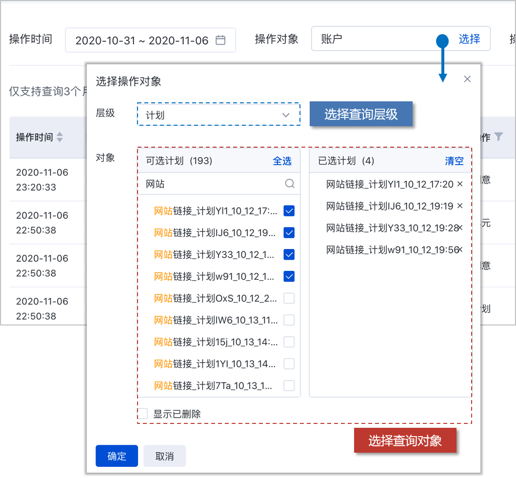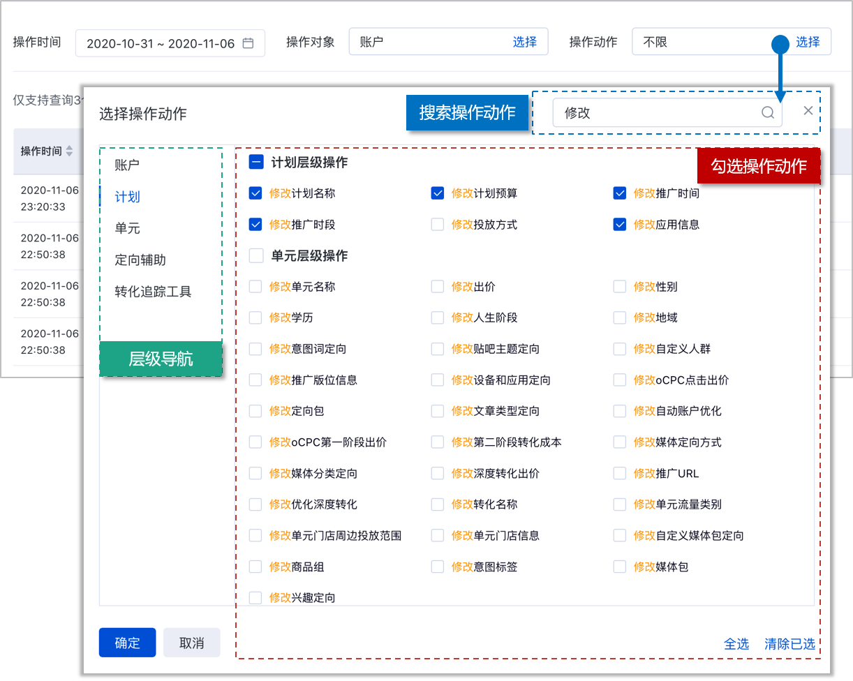 - 可勾选希望查询的操作动作,支持一键全选和清除已选(可勾选的操作动作与「操作对象」所选层级关联。如:操作对象选择「计划」层级,可勾选「计划」、「单元」和「创意」层级的操作动作)