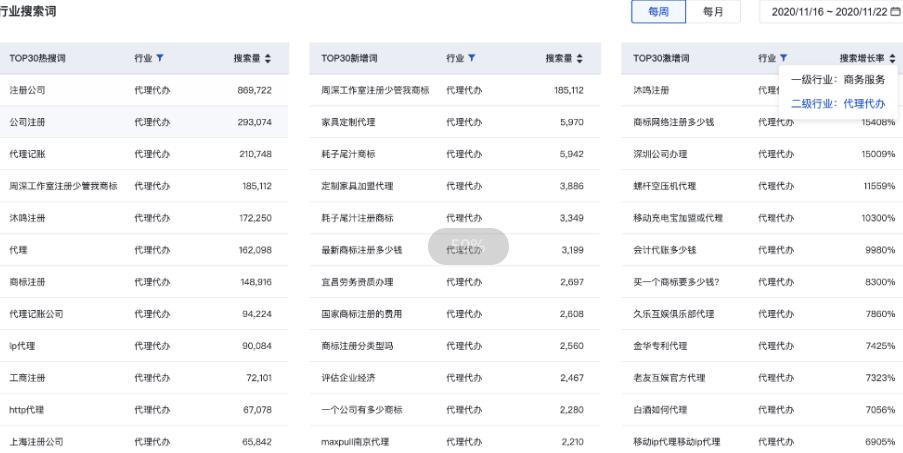1、【洞察中心】行业流量洞察:可支持分析账户所有一级行业/二级行业,分别的搜索趋势及相应行业下的top热搜词、新增词以及激增词,并且可以筛选移动和计算机。