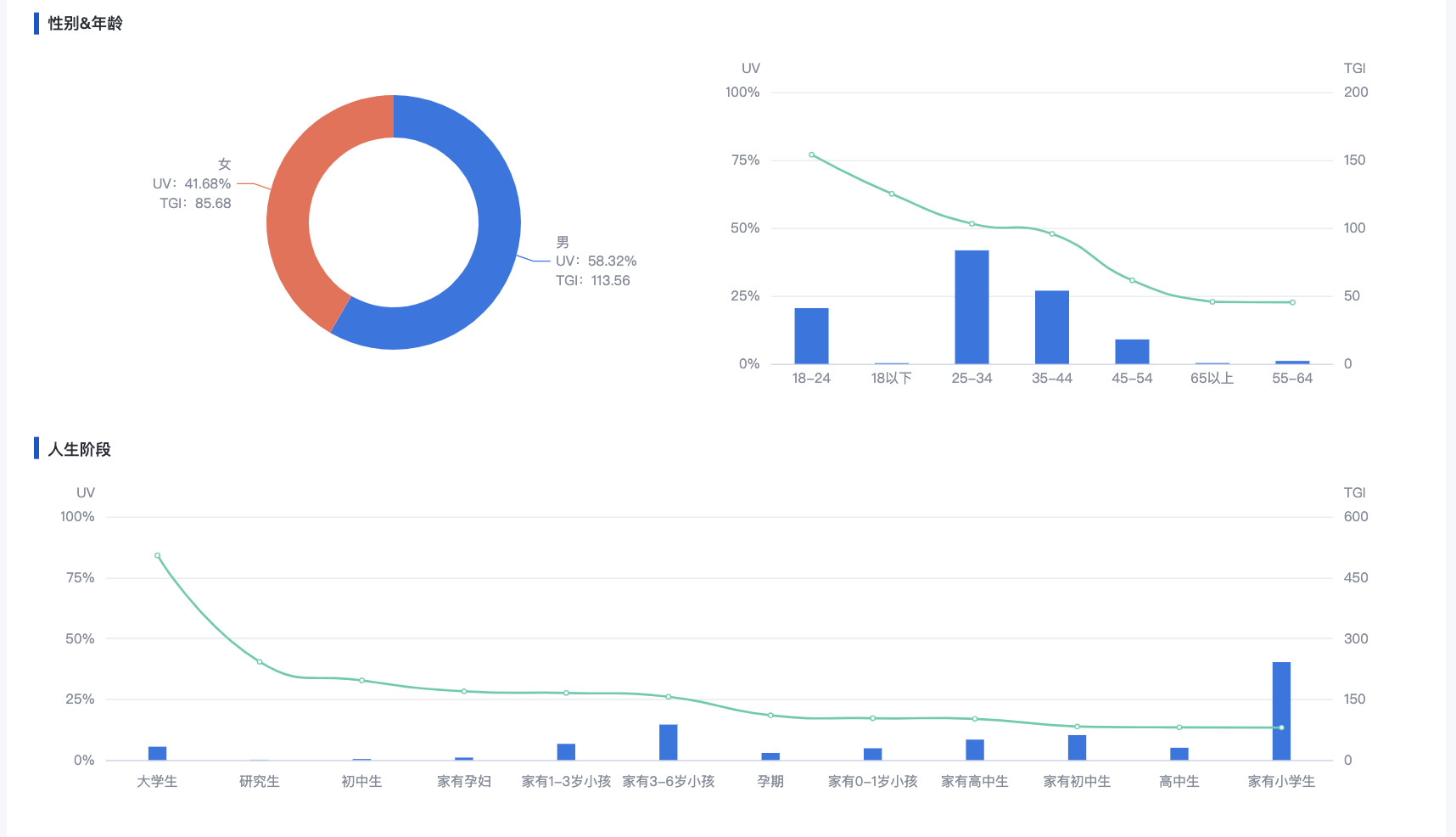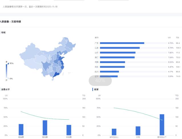 - 人群洞察:可支持分析账户所有一级行业/二级行业,分别的人群特征,包括:地域/消费水平/教育/性别年龄/人生阶段/兴趣属性/APP安装TOP50/TOP搜索词。同时,平台会每月定期更新画像数据。