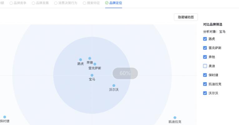 b) 功能截图:从消费者的多品牌信息了解行为(搜索/阅读/观影等)中,提取品牌关系数据,展现所选主品牌与竞品相似度/竞争关系。不同品牌间,相隔距离越小,关系越紧密(相似度越高/竞争越大);相隔距离越大,关系越疏远(相似度越低/竞争越小)