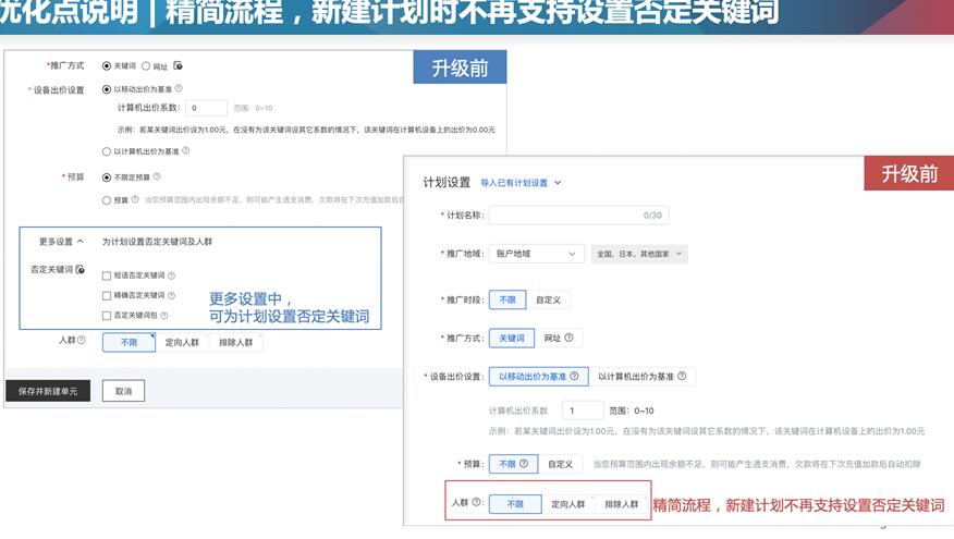 搜索推广-“网站链接”营销目标:除创意设置以外的“新建计划、新建单元和关键词页面”升级