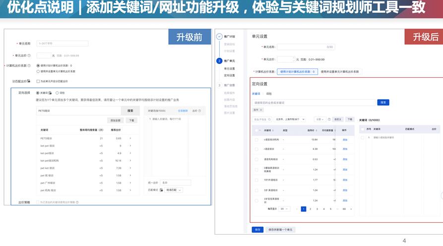 4.体验一致:升级新建流程中设置关键词/词包/网址体验,与新版关键词规划师工具一致