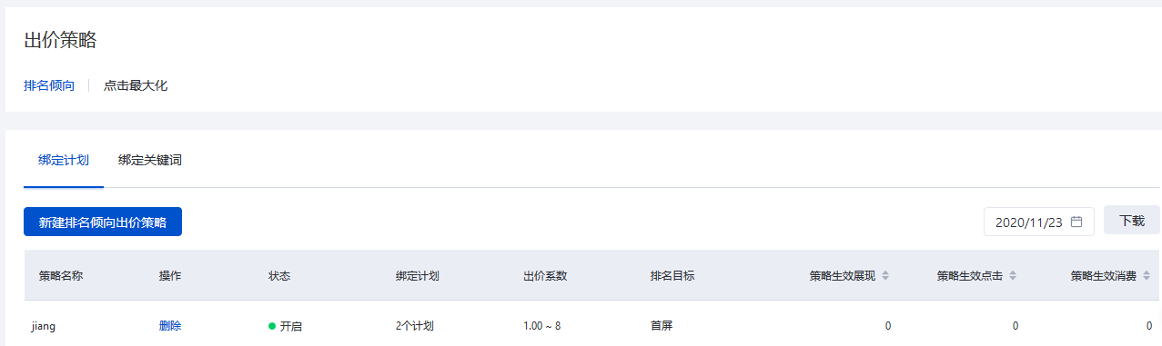 切换Tab至绑定计划,即可新建计划层级的出价策略