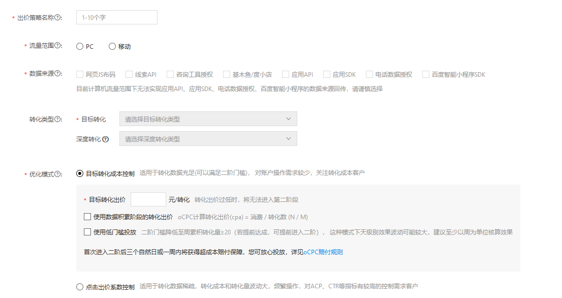 - oCPC出价策略会在名称后的括号内显示该出价策略的流量范围