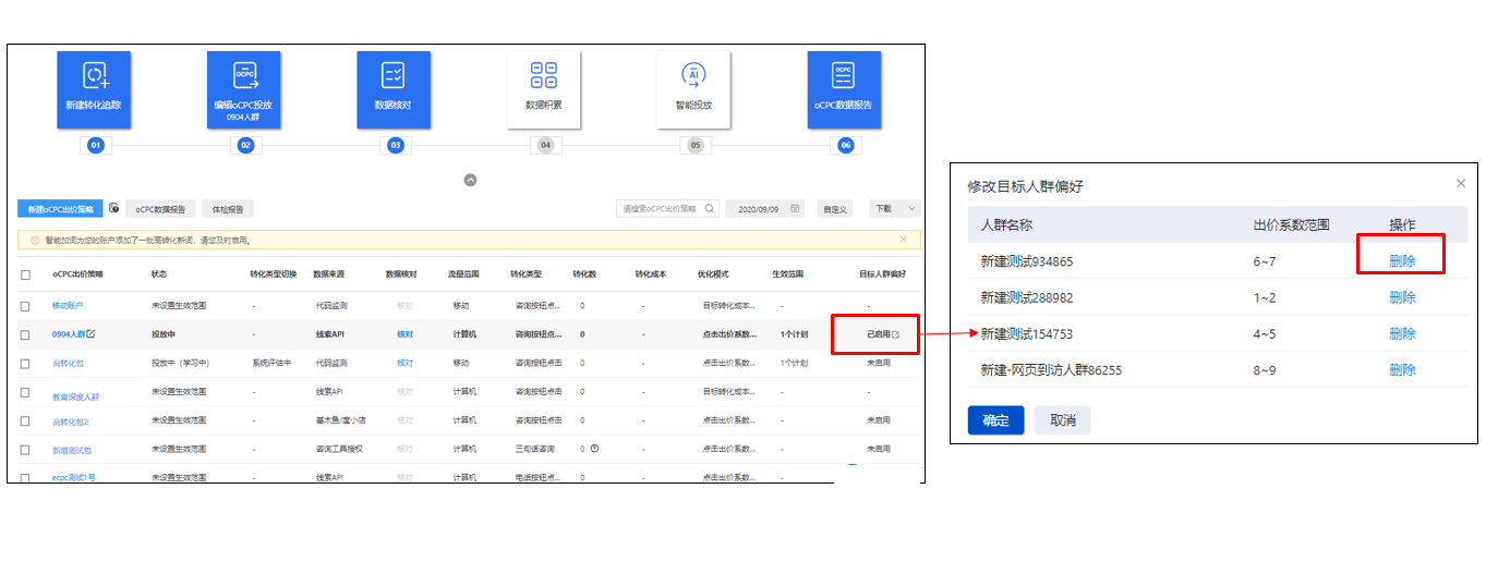 - 仅在oCPC-“点击出价系数控制”下绑定过人群包的广告主,可见目标人群偏好一列(未绑定客户不可见),点击编辑后客户除删除操作外,不可进行其他编辑