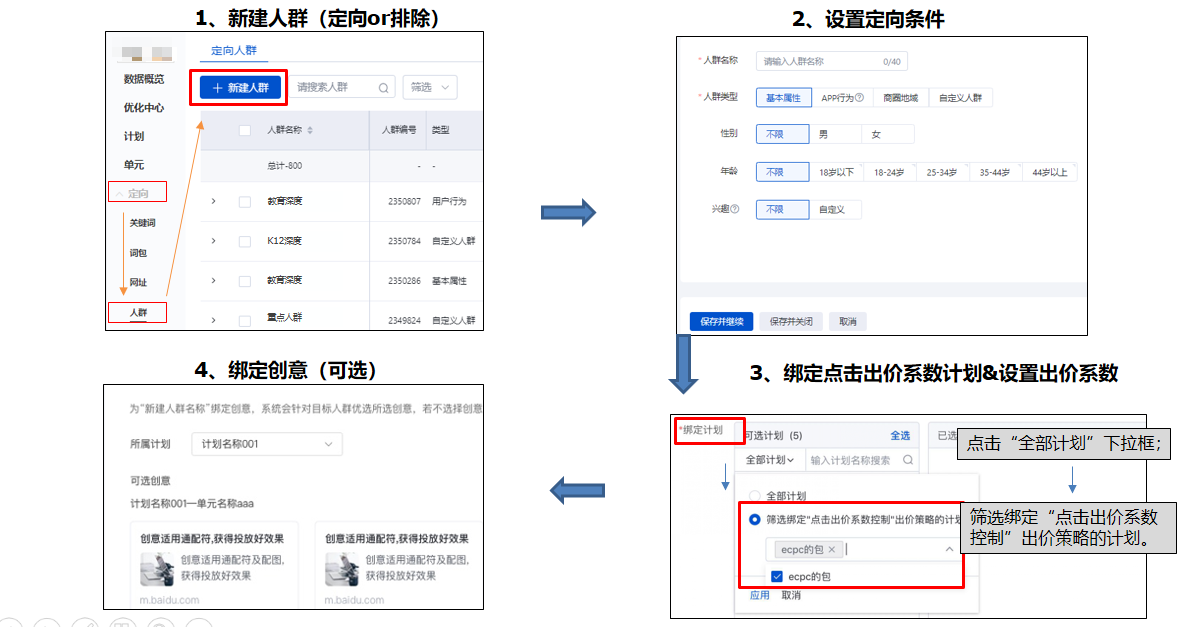 4.oCPC人群偏好功能迁移方案:在新建和人群管理流程中绑定点击出价系数控制的计划,并设置出价系数