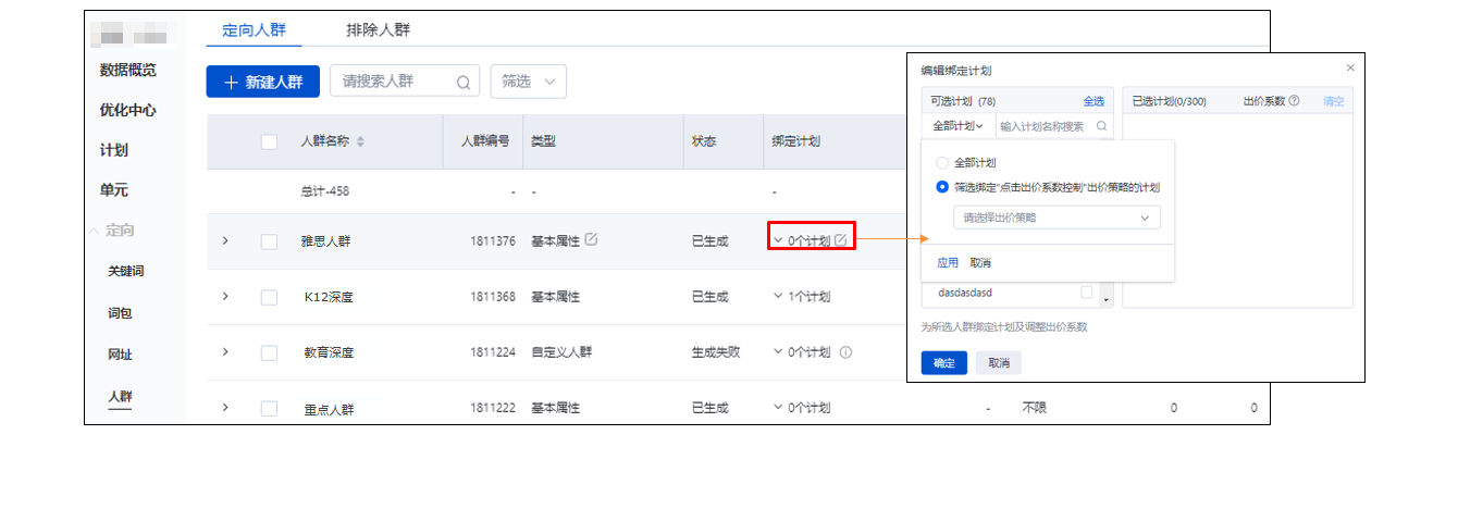 新建人群后,在人群管理列表页可以选择修改之前人群的设置,在绑定计划列选择编辑可重新编辑已绑定的计划及出价系数