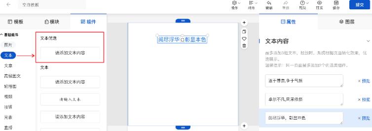2、文本优选:在基木鱼编辑器内,基础组件-文本选择“文本优选”样式(每条文本需要单独设置样式);可添加2-3组文本物料