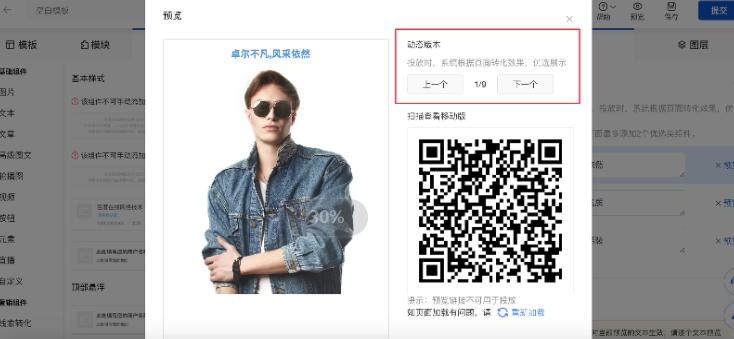 预览含有动态图文组件的页面时,可通过“上一个/下一个”切换版本,左侧预览页面同步变换,最多展示9个版本。