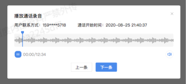 2) 点击【播放通话录音】后根据弹窗提示属于校验密码,通过后会展示录音内容弹窗,可查看录音总时长,拖动进度条,调节音量及直接切换上一条或下一条等功能。