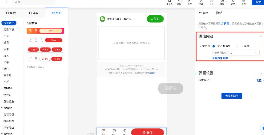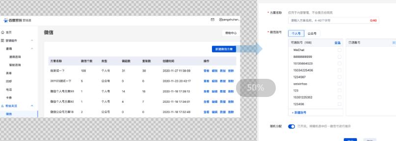 当前基木鱼的微信组件仅支持单个组件有限,且每次只能绑定30个微信号,客服维护成本高。现将微信迁移至营销通,支持客户绑定无上限的微信号(包括个人号和公众号),支持以方案维度管理账号,单方案进行上限提升。