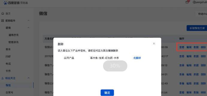 微信列表可对创建的方案进行查看、编辑、数据、删除等操作,注意:删除方案前需先解绑已应用的页面