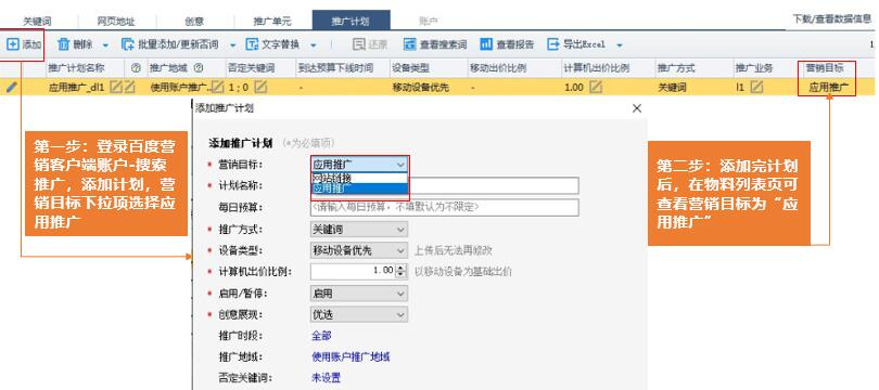 原百度营销客户端搜索推广下不支持应用推广营销目标,造成客户在批量搭建应用推广营销目标的计划单元时,无法批量上传绑定应用包,需花费很多时间进行操作。更新后百度营销客户端搜索推广将支持应用推广营销目标,满足客户批量操作的相关需求,提升投放效率。