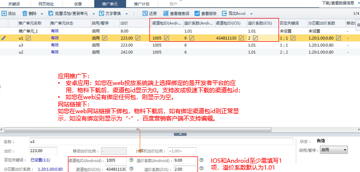 - 营销目标为应用推广下,单元层级在编辑区和物料列表区直接输入渠道包id以及溢价系数。(网站链接下不支持绑定应用)