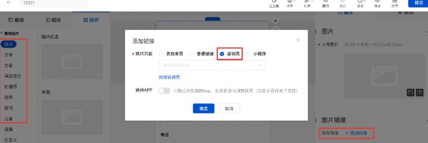 2、非咨询组件设置:进入编辑器内,选择图片、文本、高级图文、按钮、元素、金刚导航、横排列表等组件,点击添加链接,选择“咨询页“,下拉设置对应咨询方案;