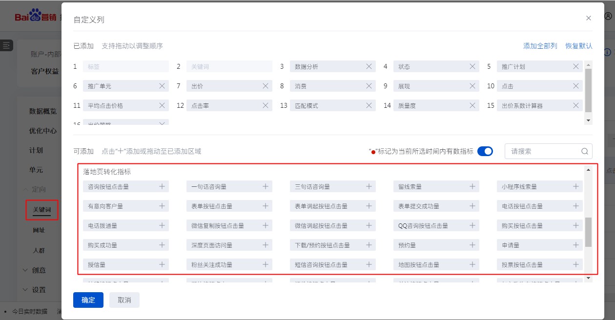 入口2:推广管理-定向-关键词(可在自定义列中添加)
