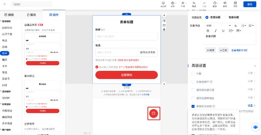 【高级设置】-【表单定位按钮】后会在手机屏幕展示区下方出现悬浮按钮,可修改按钮颜色,默认红色