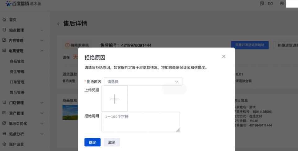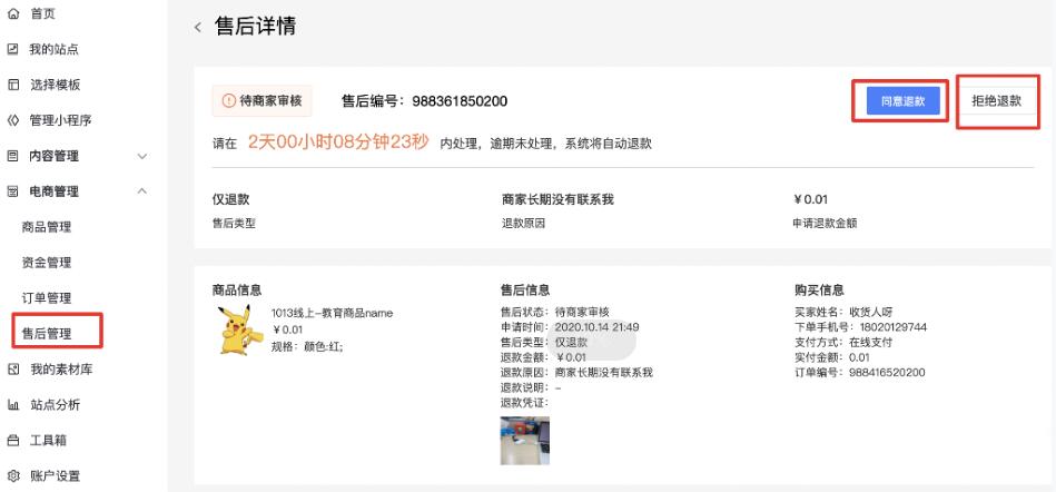 4、商家拒绝某个售后单,如网民修改退款原因后重新发起申请,此时需要商家再次在72小时内审核并作出同意退款或拒绝退款的决定,否则超时后仍会被系统自动默认为商家同意退款给网民并且货款将会原路退给网民。