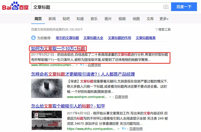我们在百度搜索一个关键词的时候,看到的搜索结果页一般是以网页标题+内容的描述的形式展现出来的。一个好的标题更吸引人点击,会有更多的用户访问。比如这篇文章标题 “如何根据SEO优化技巧写出百度更喜欢的文章标题”,其中“文章标题”就是文章的核心。